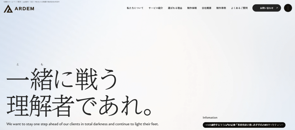 株式会社ARDEMは、「自主制作(完全内製)」と「徹底した分析」を強みとする札幌のWeb制作会社です。制作前に現状のアクセスデータや競合サイトを詳細に分析し、戦略を立ててからオーダーメイドでサイトを構築するプロセスは、成果を重視する企業にとって魅力的です。「一緒に戦う理解者であれ」というコンセプトの通り、制作して終わりではなく、公開後の伴走サポート体制も重視しています。特に、外部施策(被リンク)に頼らず、サイトの構造化やキーワード設計といった「内部SEO施工」に力を入れている点は、中長期的な資産となるサイト構築を目指す上で高く評価できます。