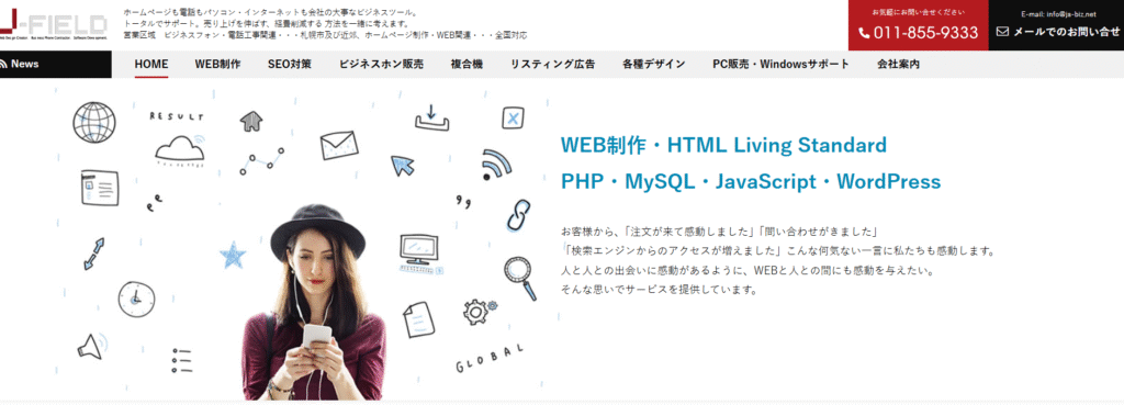 株式会社J-FIELDは、札幌市の中小企業やSOHO(小規模事業者)にとっての「IT・Webなんでも相談所」のような存在です。最大の強みは、Web制作やSEO対策だけでなく、ビジネスフォン、複合機、LAN工事、PCサポートといったオフィスのITインフラ全般をワンストップで提供できる点にあります。Web専門の担当者がいない、あるいは「ホームページもオフィスの電話もまとめて面倒を見てほしい」といったニーズを持つ企業に最適です。Webマーケティングの高度な戦略立案というよりは、地域密着型で、ビジネスの土台となるIT環境とWeb活用を包括的にサポートする実務的な支援を得意としています。