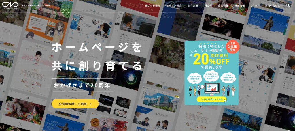 株式会社クリエイティブネットドアは、東京と札幌の2拠点体制を活かしたバランスの良さが最大の強みです。東京拠点で最新のデジタルマーケティング戦略を立案し、札幌拠点で高い技術力を持つ制作・開発チームがそれを形にするという、理想的な分業体制を敷いています。内製率が90%以上と高く、戦略策定から制作、システム開発、保守・運用まで一気通貫で依頼できるため、品質の担保とスムーズな連携が期待できます。特に、制作後の保守・運用を「Web事業部」として代行するサービスに力を入れており、戦略的なサイト運用を丸ごと任せたい企業にとって、信頼できるパートナーとなるでしょう。